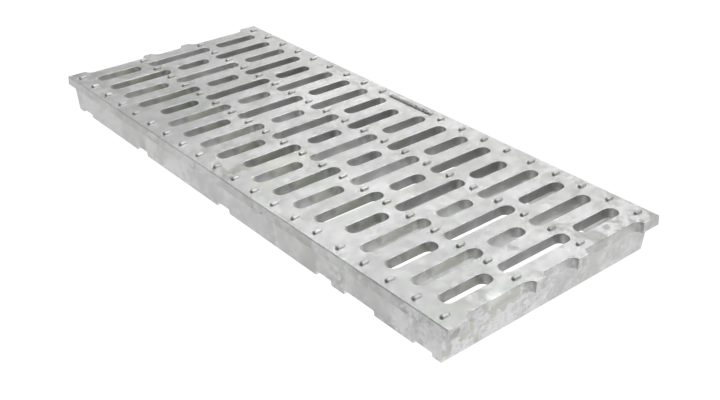 Grating shall be 10SBAC24DGD heavy duty ADA compliant slotted grate. The grate shall be made of grade 65-45-12 cast ductile iron conforming to ASTM A 536-84. The grate shall be hot dip galvanized per ASTM A-123. The grate shall be 10″ wide x 24″ long x 1.5″ thick and have a minimum load rating of DIN Class D (exceeds H-20/HS-25).