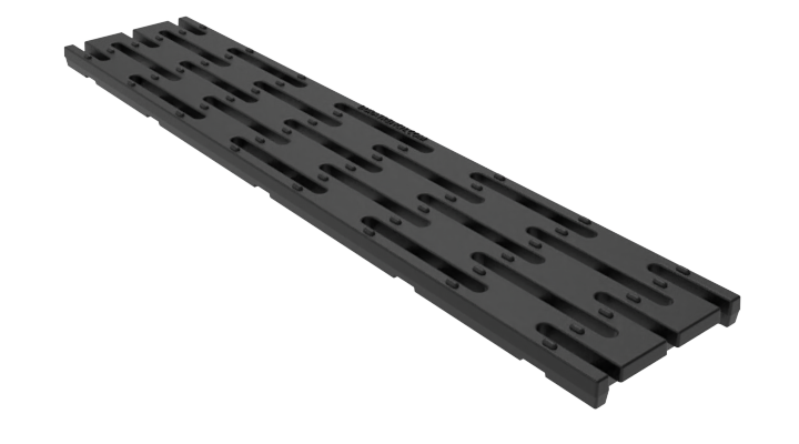 Grating shall be 05SLHC24DBD heavy duty heel proof and ADA compliant longitudinally slotted grate. The grate shall be made of grade 80-55-06 cast ductile iron per ASTM A 536-84. The grate shall be e-coated black. The grating complies with the requirements of the Americans with Disabilities Act handbook section 4.5.4. The grate shall be 4.875″ wide x 24″ long x 0.75″ thick and have a minimum load rating of DIN Class D (exceeds H-20/HS-25).