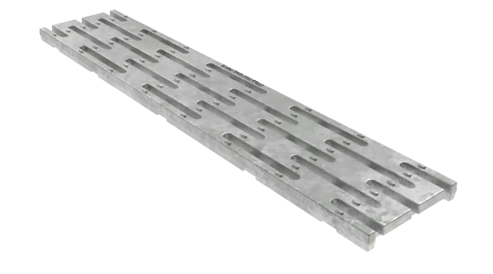 Grating shall be 05SLHC24DGD heavy duty heel proof and ADA compliant longitudinally slotted grate. The grate shall be made of grade 80-55-06 cast ductile iron per ASTM A 536-84. The grate shall be hot dip galvanized per ASTM A-123. The grating complies with the requirements of the Americans with Disabilities Act handbook section 4.5.4. The grate shall be 4.875″ wide x 24″ long x 0.75″ thick and have a minimum load rating of DIN Class D (exceeds H-20/HS-25).